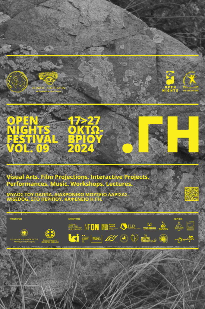 Το δια-καλλιτεχνικό και δι-επιστημονικό φεστιβάλ OPEN NIGHTS διοργανώνεται από την ομάδα OFF ART – Σκηνικές Παρουσίες και την Αντιδημαρχία Πολιτισμού του Δήμου Λαρισαίων με την υποστήριξη του ΥΠΠΟΑ και της Περιφέρειας Θεσσαλίας.